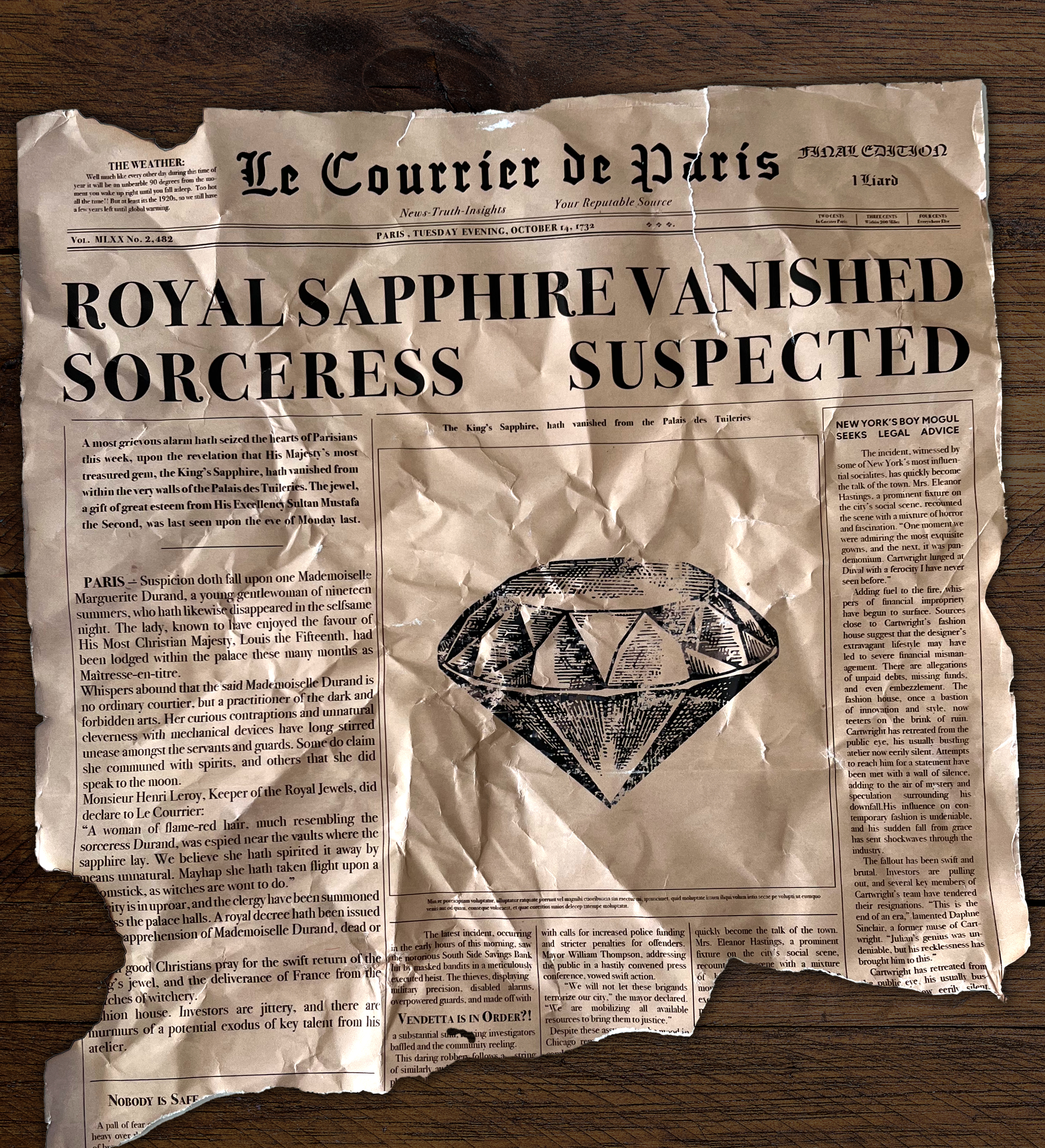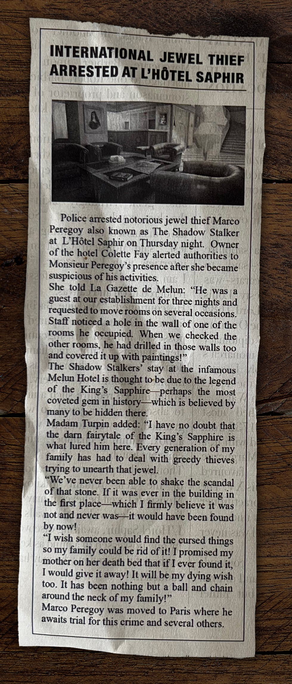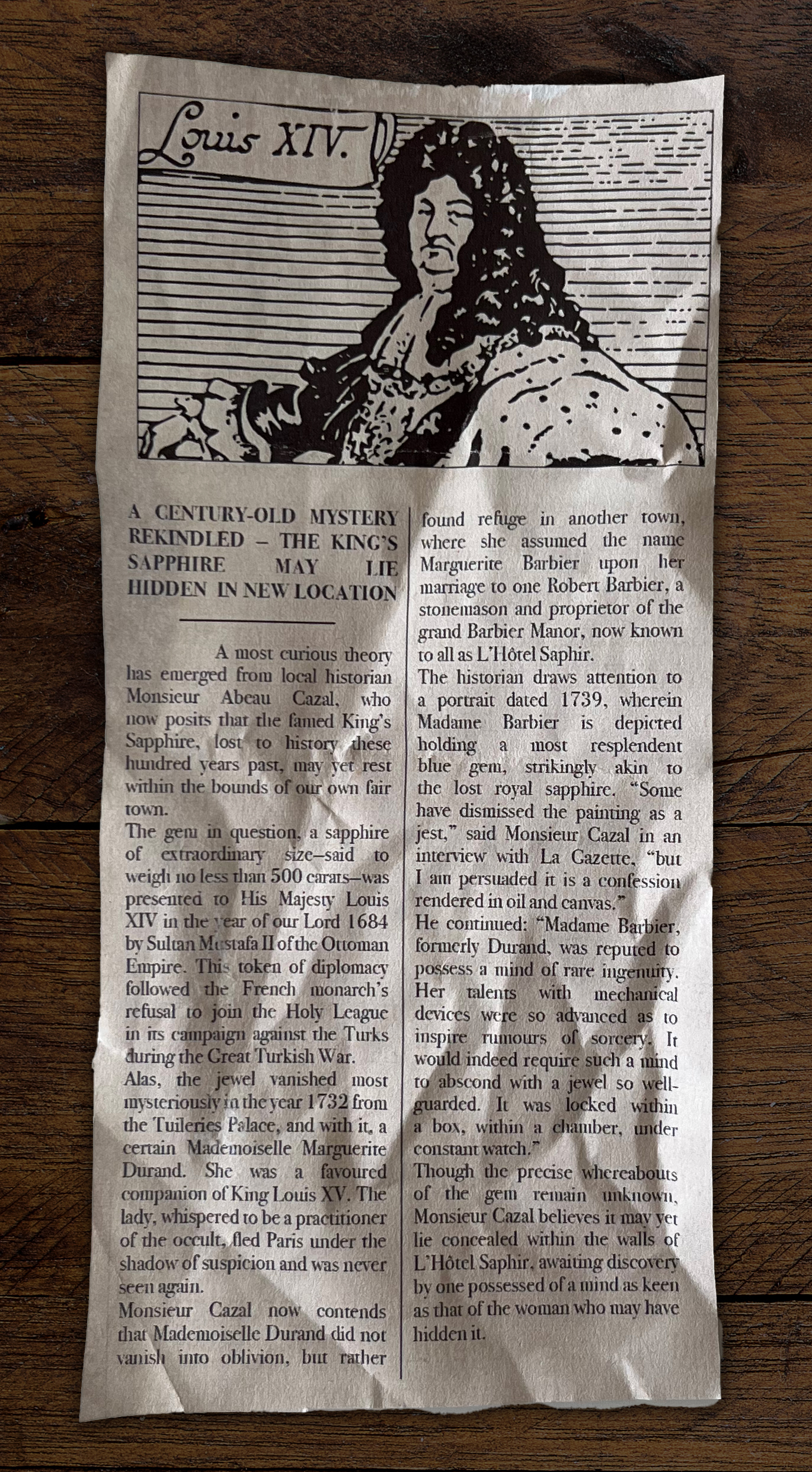 We're so close to unraveling this 300-year-old mystery! The King's Sapphire was stolen by the monarch's mistress, Marguerite Durand, in 1732. It's been hidden in the Hôtel Saphir ever since, but we're determined to find it and save this aging property.