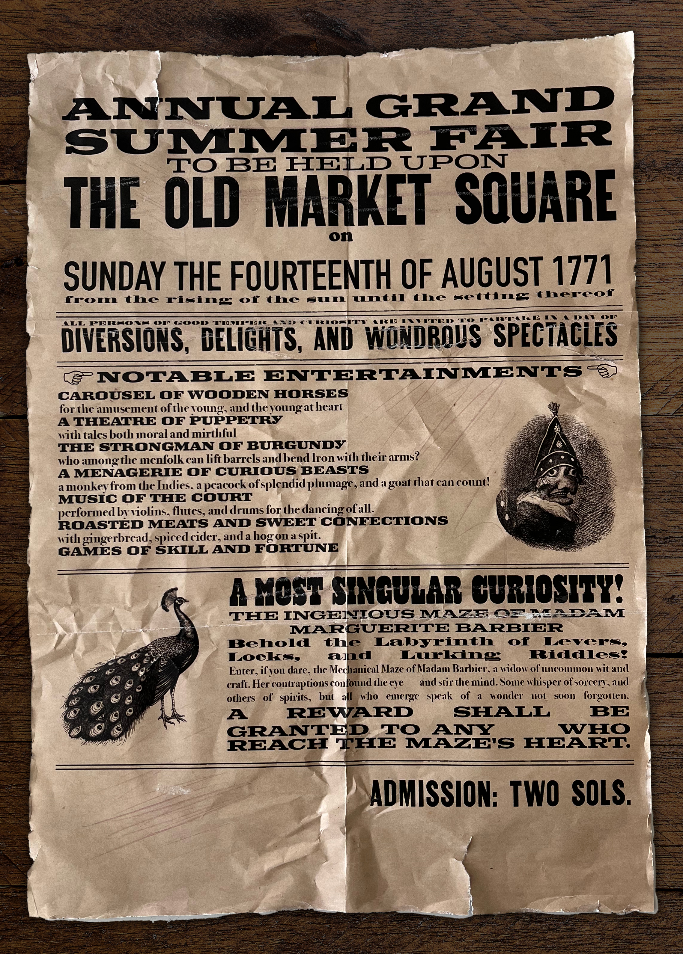 July 13th, 1771. ‘Enter, if you dare, the Mechanical Maze of Madame Barbier, a widow of uncommon wit and craft. Her contraptions confound the eye and stir the mind!’